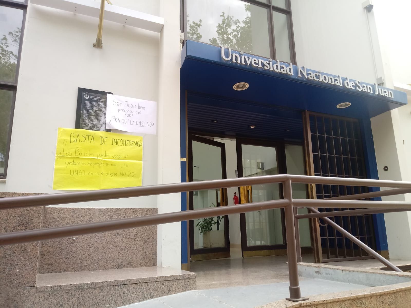 En ese contexto fue los padres de los chicos iniciaron su reclamo. Esta mañana, a primera hora, colocaron una serie de carteles en las paredes de la fachada del Rectorado, en los que se puede leer mensajes como: "Presencialidad 100% ya", "Basta de incoherencia. ¿Los boliches pueden asegurar protocolos de presencialidad y la UNSJ en sus colegios, no?", "Basta de burocracia y mentiras" y "San Juan tiene presencialidad 100%, ¿por qué la UNSJ, no?".