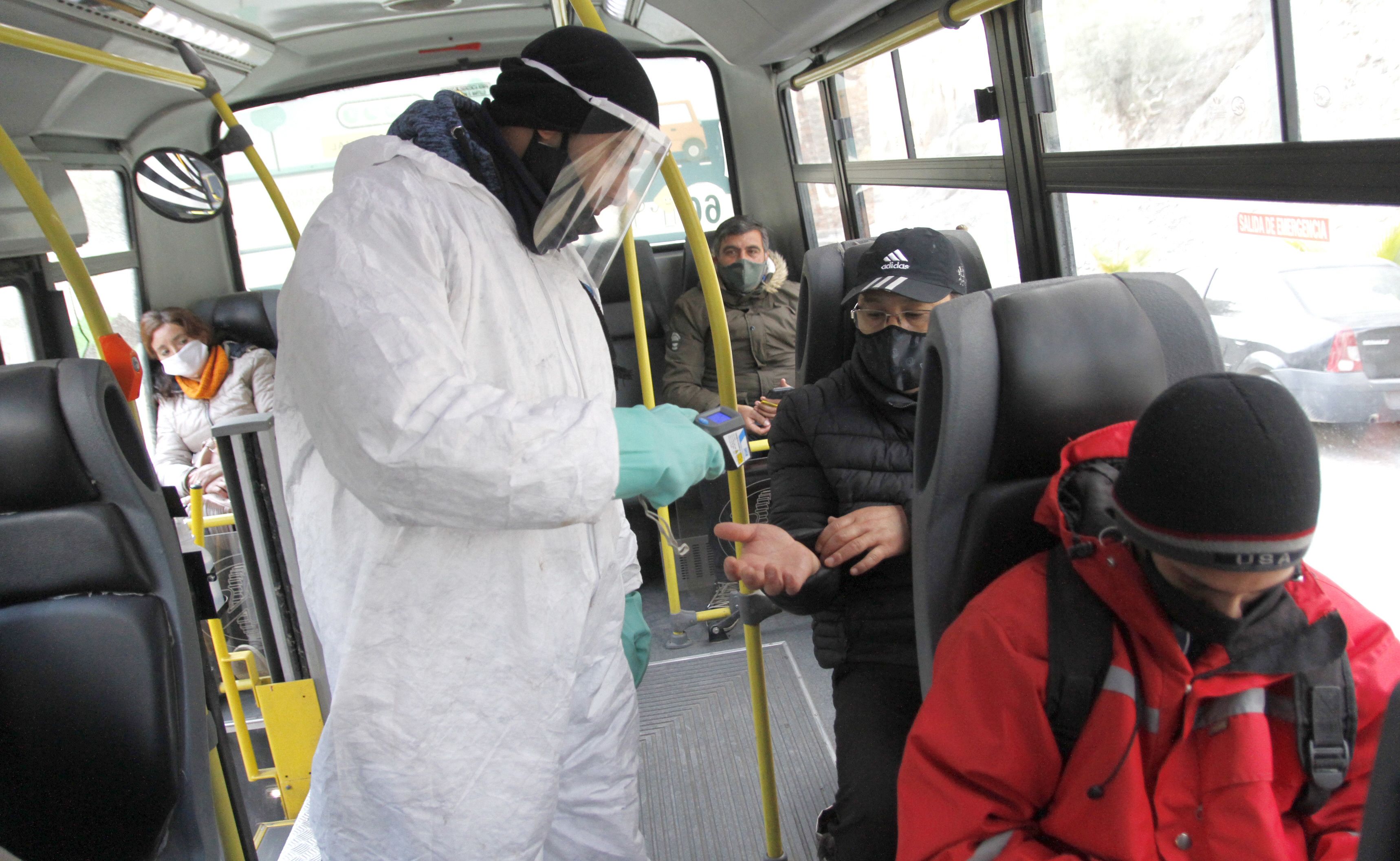Seguridad. Después de que la Policía solicita los permisos de circulación, los pasajeros que llegan en colectivo se someten a la toma de temperatura.