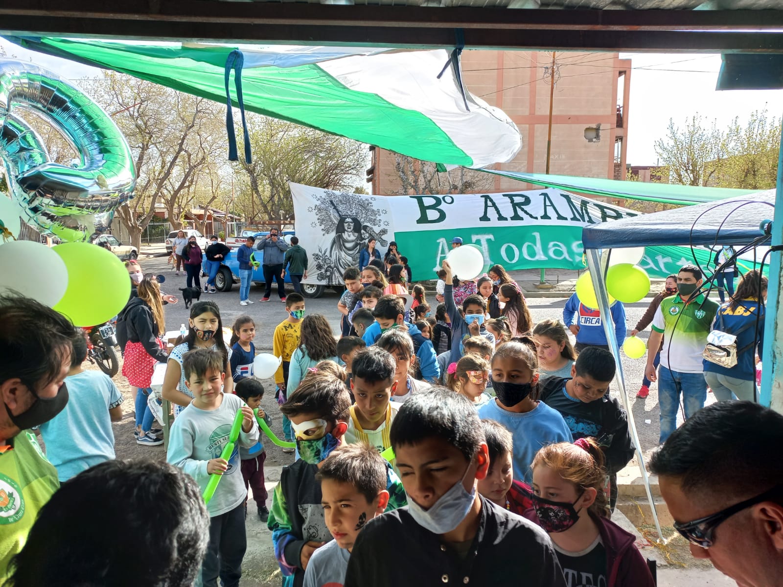 Cumpliendo protocolos sanitarios, hubo chocolate con facturas, payasos animando, personas que pintaron os rostros de los niños con colores verde y blanco, juguetes y golosinas para todos y el sorteo de dos bicicletas y 10 pelotas de fútbol.