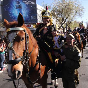 Como había mucha gente, sus papás decidieron apostarse hacia el final del desfile, casi llegando a calle Mendoza. Pero, como los últimos serán los primeros, Facundo no tardó en llamar la atención del jefe de Comunicaciones del Regimiento de Mendoza, Diego Marhem. Es que el niño, luciendo orgulloso su traje, le confesó al Mayor que quería ser como San Martín cuando fuese grande y que quería estudiar para ser Granadero. Emocionado, Marhem lo tomó entre sus brazos y lo introdujo en el centro del desfile. El jefe de Comunicaciones no dudó en detener a la tropa a caballo para que el niño se tomara foto con las mulas y con los granaderos. Mientras tanto, dio una clase de historia a todos los chicos que estaban apostados en el lugar. “San Martín cruzó la cordillera en una mula. Estos animales están preparados para caminar por la montaña y a grandes alturas”, explicó el militar. Mientras que Facundo, que ya no entraba en su atuendo de la alegría, no dudó en recordarle que “San Martín cruzó la cordillera por San Juan”.