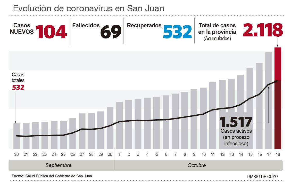 Un alivio. Podría considerarse de esa manera la baja en la cifra de casos de coronavirus registrados en la provincia ayer. Con 104 nuevos infectados, según el parte de Salud Publica, San Juan sumó en sólo siete días 840 casos que hicieron que la cifra acumulada trepara a los 2.118. Lejos, fue la semana más dura en la provincia desde que comenzó la pandemia. Es que el sábado se había marcado un récord en contagios diarios con 226. En tanto que el jueves, se habían registrado 149.