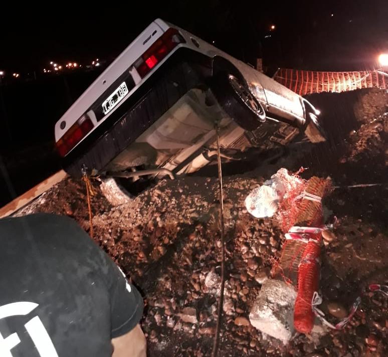 Anoche, en medio de la tormenta un automovilista no se percató de la señalización en una obra de cloacas (según muchos de los vecinos es deficiente la  indicación en el lugar) y cayó al zanjón.