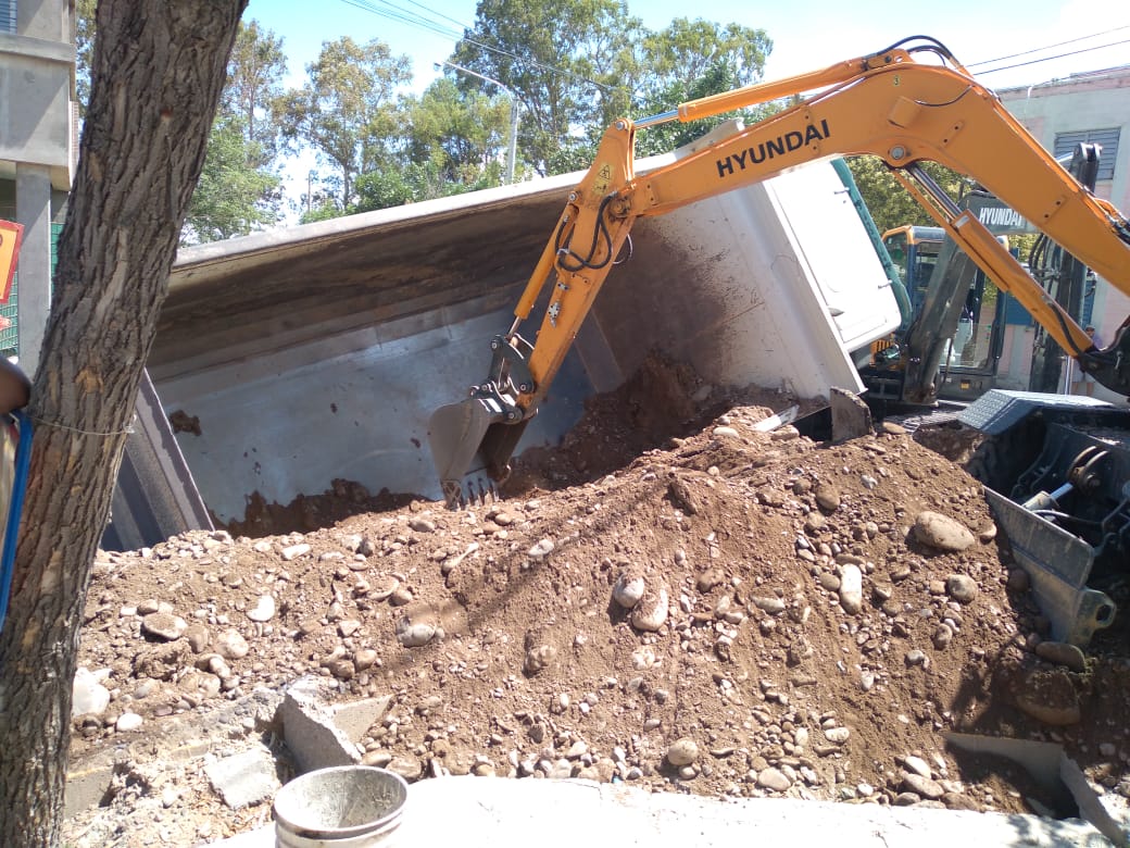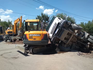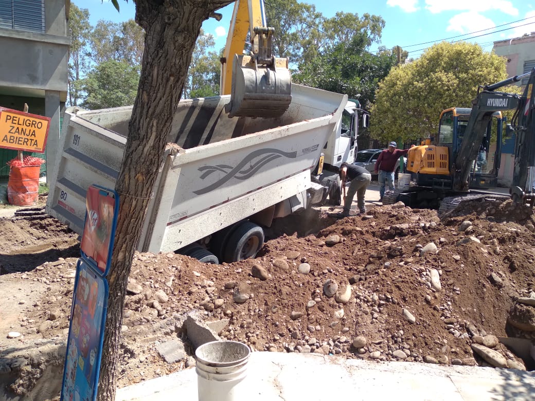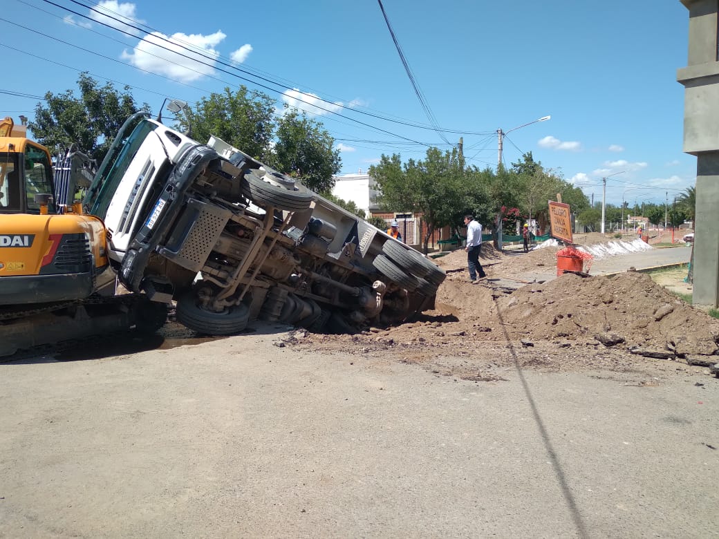 Este lunes en la tarde se registró un accidente en una obra cloacal de Rivadavia, donde un camión se hundió al ceder el suelo mientras era cargado con escombros.