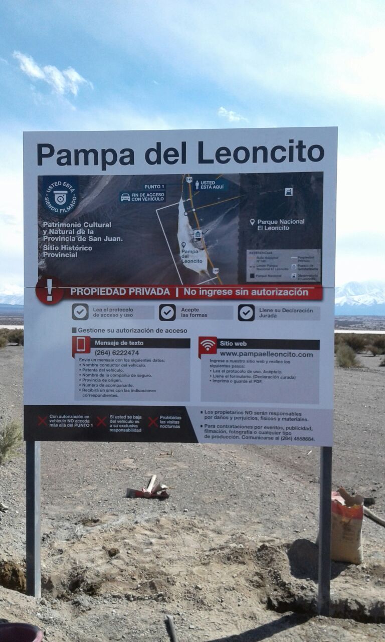 En los últimos días apareció un cartel en el ingreso a la Pampa del Leoncito, en Calingasta, que informa que nadie puede ingresar al lugar sin antes registrarse a través de mensaje de texto o de una página web. La indicación generó gran revuelo en las redes, debido a que si bien el terreno es privado, la zona que es Patrimonio Cultural y Natural de la provincia es uno de los platos fuertes de la oferta turística de San Juan.