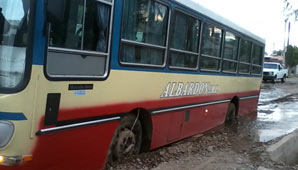 San Juan, 1 de octubre.- Durante la mañana de hoy, en el interior del Barrio Los Andes, un colectivo cayó en un pozo de cloacas. Todo ocurrió minutos después de las 8, cuando el micro de la línea 20 circulaba por calle Porres, a la altura de San Martín, en el interior del barrio Los Andes, de Chimbas.