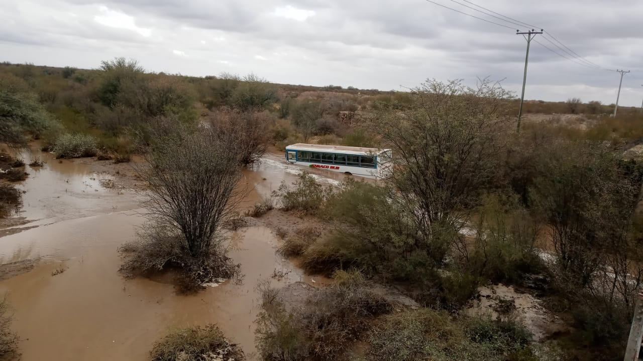 La creciente generada por las fuertes lluvias dejó intransitable el camino de la ruta 318, que conecta Cañada Honda con Huanacache y un colectivo con gente en su interior intentó cruzar pero no lo logró.