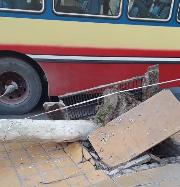 La mañana de este lunes comenzó con un siniestro en pleno centro que podría haber terminado en desgracia. Un colectivo se llevó por delante un cable, que hizo tracción sobre un árbol, que terminó cayendo.