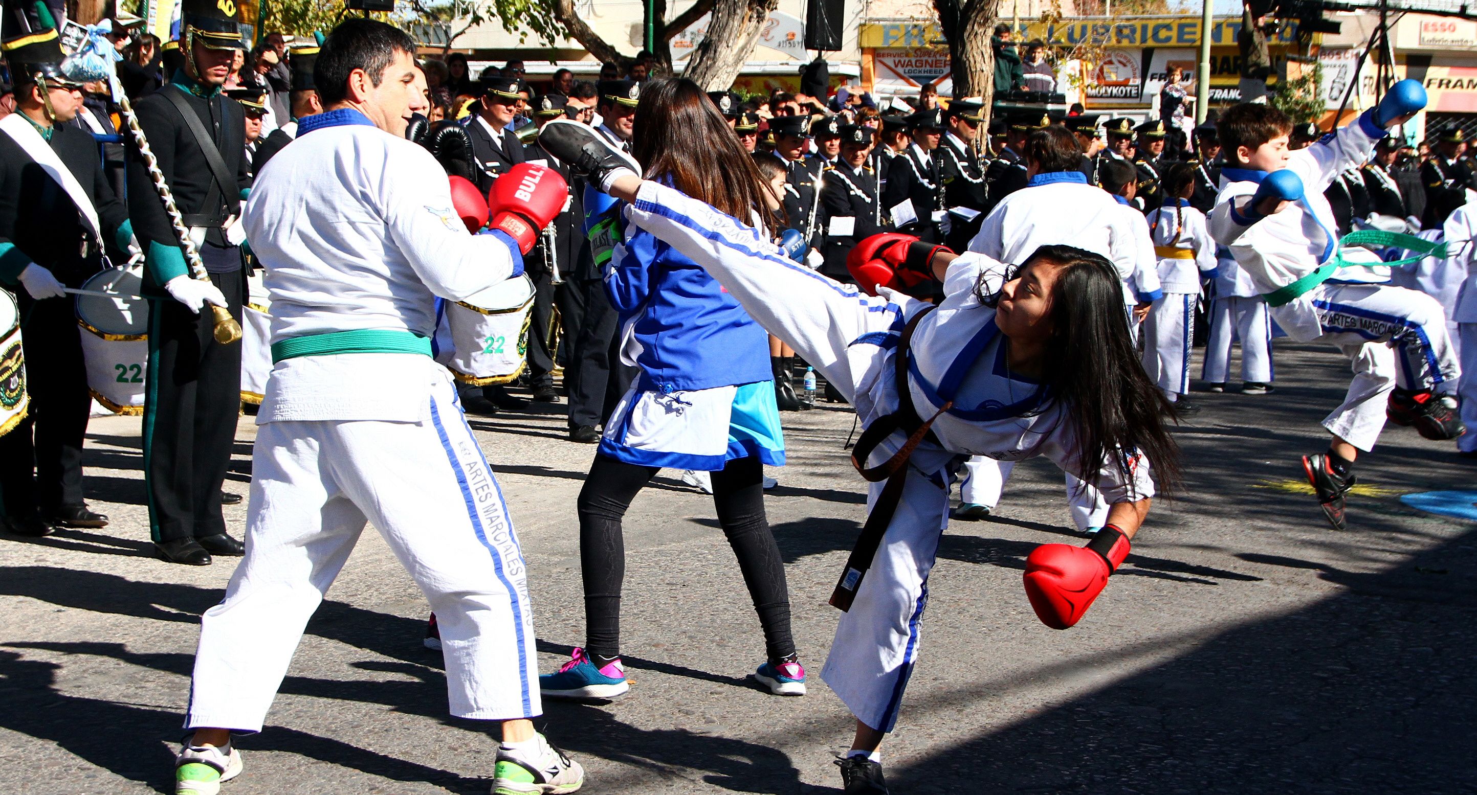 Las instituciones deportivas que participaron del desfile tuvieron que demostrar sus habilidades frente al palco oficial. Las escuelas de artes marciales mostraron algunos de los ejercicios básicos que realizan.