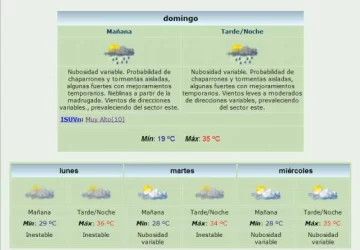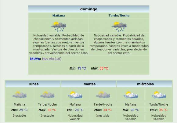 Además la máxima estimada es de 35 grados, temperatura que se prevé se mantendrá para el inicio de la semana, con un pico de temperatura que rondará los 36 grados y el cielo inestable. La mínima para este lunes será muy elevada, 29 grados.