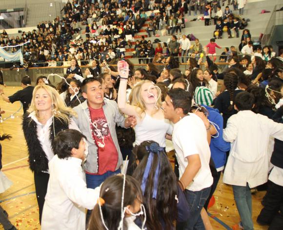 Con los uniformes, los guardapolvos blancos y los zapatos bien lustrados los estudiantes armaron un trencito e incluyeron a todos. Ni Matías, un alumno de la Escuela Superior Sarmiento que anda en silla de rueda, quiso perderse la fiesta. Bailó ayudado por sus compañeros y no paró de contagiar sonrisas.