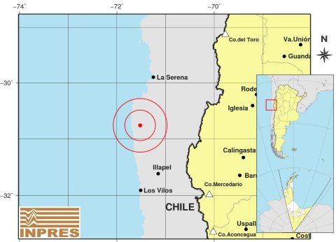 En rigor, el epicentro tuvo lugar 299 km al O de San Juan; 345 km al NO de Mendoza; 91 km al S de Coquimbo -30.760 (lat) -71.521 (long).