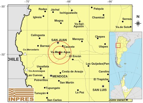 El epicentro se registró a 7 kilómetros al Norte de Media Agua, en Sarmiento, y 46 kilómetros al Sur de San Juan. Tuvo una profundidad de 118 kilómetros.
