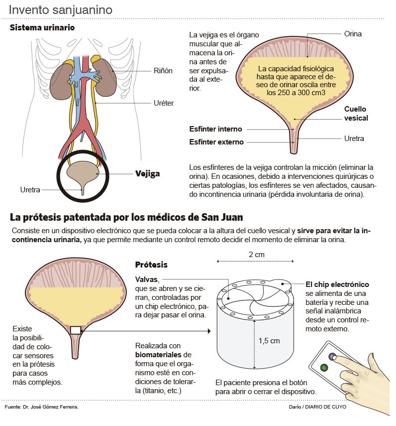 Los pacientes que padecen de incontinencia urinaria podrán contar con un dispositivo electrónico que les permitirá controlar este trastorno. Se trata de una prótesis ideada por José Gómez Soler y José Gómez Ferreira, dos médicos sanjuaninos que ya obtuvieron la patente de su invento.