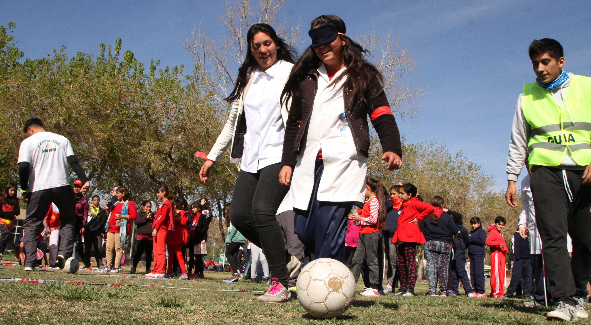 Sin dudar, el nene tomó la cuerda y empezó a guiar por el andarivel a su compañero que tenía los ojos vendados. En pocos segundos corrieron varios metros. El primero guió al segundo y así ambos pudieron experimentar las vivencias de una persona ciega. Esto fue lo que pudieron aprender ayer unos 600 alumnos de 20 escuelas sanjuaninas al participar del II Encuentro Provincial Saludable, Deportivo y Solidario, en el marco de la actividad llamada "Ponete en el Lugar del otro". Así, el programa "Nutrición en Vivo", desembarcó en el predio de El Palomar con muchas actividades para aprender hábitos saludables y para compartir. Además participaron las escuelas de Educación Especial José A. Terry, Bilingüe y Braille.