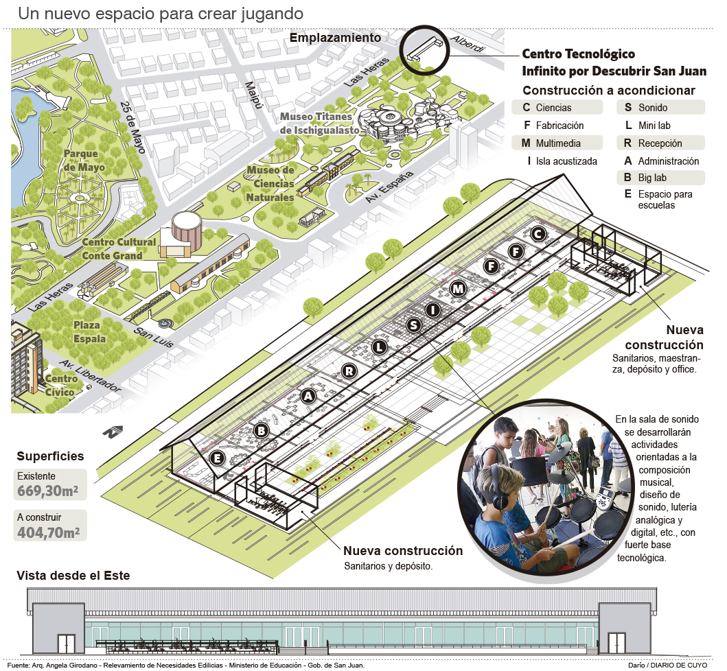 San Juan será la quinta provincia en tener un centro tecnológico de este tipo. Ya hay en Posadas, Mendoza, Bahía Blanca y Jujuy. Estará destinado a niños de entre 6 y 18 años. Allí podrán crear proyectos relacionados con la robótica, programación, videojuegos, arte, diseño y hasta de biotecnología. A través de talleres, laboratorios y el trabajo de especialistas en nuevas tecnologías, este centro de innovación propondrá crear entornos de aprendizaje donde la curiosidad será la protagonista. "Lo que se busca es poner al alcance de la comunidad herramientas que les permiten a nuestros chicos experimentar y comenzar a explorar sus pasiones", dijo la arquitecta Angela Giordano, directora de Relevamiento de Necesidades Edilicias del Ministerio de Educación.