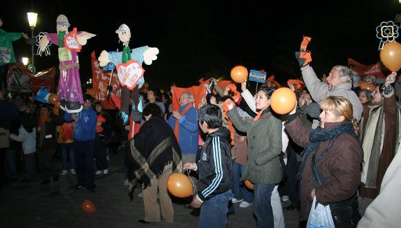 Anoche a las 20, la plaza 25 de Mayo se llenó de carteles, globos y gente vestida de color naranja. Frente a la estatua de Sarmiento se reunieron familias enteras y gritaron "queremos una familia con papá y mamá". A nadie le importó los 5 grados de temperatura ni los 2,1 de sensación térmica. Y todos permanecieron casi una hora y media cantando la canción del Mundial de Fútbol de David Bisbal a la que le cambiaron la letra y la tomaron como su himno, que se mezclaba con las bocinas de los autos que pasaban por las calles que rodean la plaza y adherían a la manifestación.