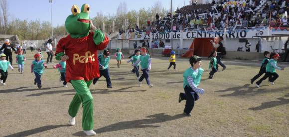 Los niños de los jardines de infante del municipio y de las escuelas entraron a la cancha del Club Atlético de la Juventud Alianza, en fila, con sus seños y luciendo pecheras de colores. Algunos estaban disfrazados de ranas, otros tenían viseras de jirafas o de patitos y todos saludaron con sonrisa al Sapo Pepe, que después los acompañó en la carrera.