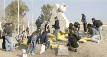Lo primero que hicieron fue lijar la base del monumento para eliminar los restos de pintura vieja y descascarada. Después, pintar ese sector y el mapa de San Juan apoyado sobre el mismo. Trabajo que hicieron sin descanso y con los elementos que ellos mismos compraron.