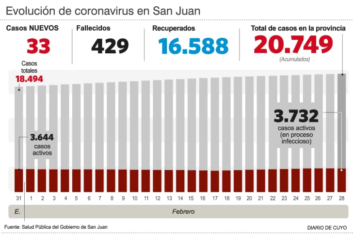 El Ministerio de Salud Pública informó este domingo las cifras diarias de coronavirus: se registró un nuevo deceso a causa de Covid-19 y otros 33 nuevos casos. El fallecido es un hombre de 51 años, oriundo de Capital, que estaba internado en el Hospital Dr. Marcial Quiroga.