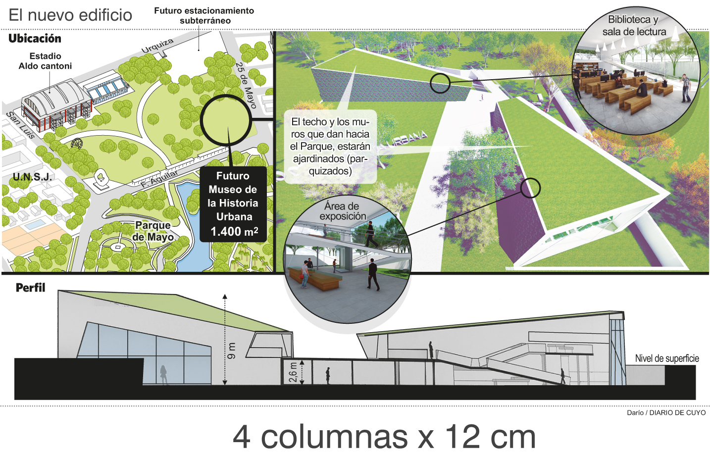 Su fachada es digna de admiración y hace bastante tiempo que está a la vista de todos. Pero, aún nadie vio su corazón ni conoce qué va a exhibir cuando abra sus puertas al público. Es el Museo de la Historia Urbana (MHU), dependiente de la Municipalidad de la Capital, cuyo nuevo edificio ya quedó listo para funcionar. DIARIO DE CUYO pudo recorrer las instalaciones para mostrar su asombrosa arquitectura y contar las propuestas que se pondrán en juego para cumplir con su objetivo primordial: lograr que la gente forme parte de la historia. Aún no se determina la fecha de inauguración, pero sí sus principales características. Será un museo tecnológico, interactivo y dinámico para que todos, desde los niños hasta los abuelos, puedan disfrutar de su visita. La obra se licitó en el 2017 y tuvo un costo de 64,3 millones de pesos. No hace falta ingresar al lugar para comenzar a deslumbrarse. Los jardines colgantes en los muros del ala este son una verdadera obra de arte que sirve de antesala para imaginarse el interior del museo. Ya adentro se puede apreciar la forma irregular de las dos estructuras que conforman el edificio, unidas por puentes y pasarelas en diferentes niveles (ver infografía). También se puede apreciar la amplitud de espacios iluminados naturalmente a través de las paredes vidriadas y que tienen una organización simple