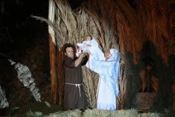 El show del pesebre en vivo llegó luego de la animación de algunos artistas. Un Adán y una Eva comenzaron a actuar, luego los profetas, los reyes, el pueblo, y decenas de actores entre ellos caballos y burros. Fue más de hora y media en la que se mezclaron el relato y la actuación, la música, los efectos de luces y sonidos, y hasta escenas con odaliscas bailando y otras un tanto arriesgadas, como las de María y José bajando por la ladera del empinado cerro en burro o como la del ángel Gabriel que subió y bajó por el cerro colgado de un cablecarril.