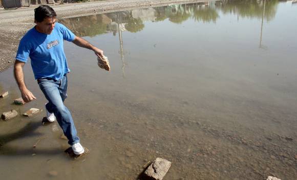 El que sí se animó a pasar por el camino de piedras fue Marcelo Díaz (foto), otro vecino que había llegado desde el otro lado de la ruta para comprar facturas. El hombre comentó que, si bien el canal suele desbordarse, nunca se había inundado así la zona y dijo que el agua está allí desde hace unos 8 días. "Es un problema, no sólo porque es incómodo, sino también porque es agua estancada y para prevenir la proliferación del dengue tendrían que sacarla", reflexionó el hombre antes de comenzar a hacer equilibrio por el camino improvisado. Es que la basura que hay en el lugar y los papeles y bolsas que salieron del canal, coparon el espacio. Y en el agua sucia y quieta ya se pueden ver algunos bichos y mosquitos.