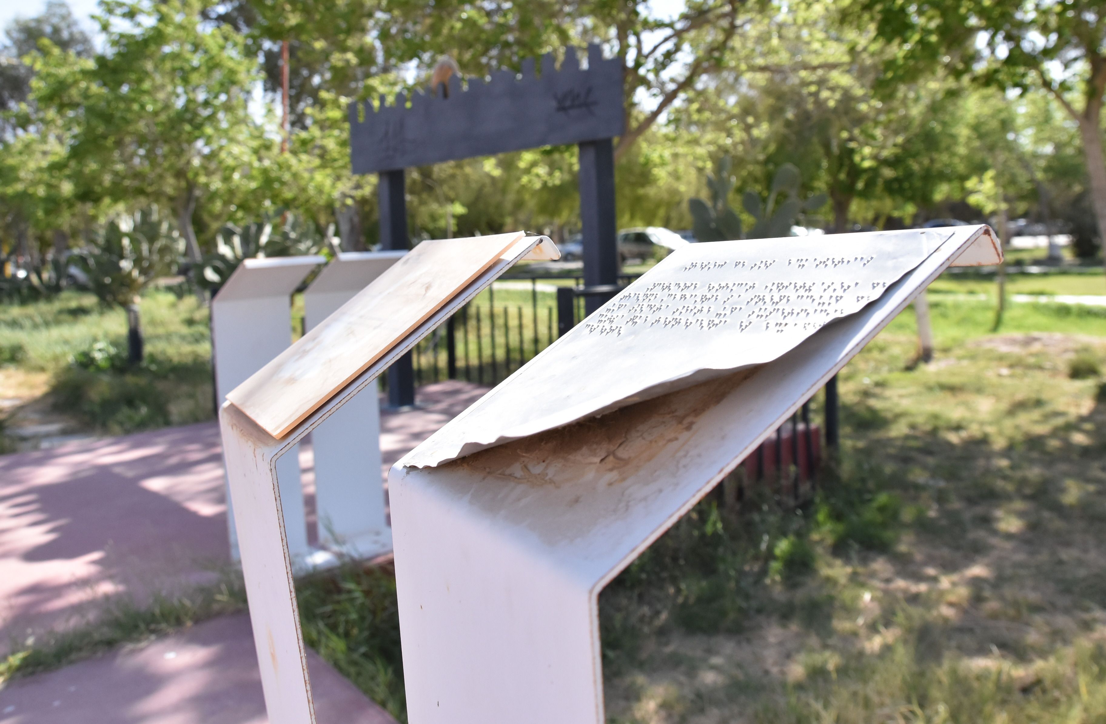 Destrucción. Los vándalos rompieron la mayoría de las placas escritas en Braille que hay en este parque con finalidad inclusiva.