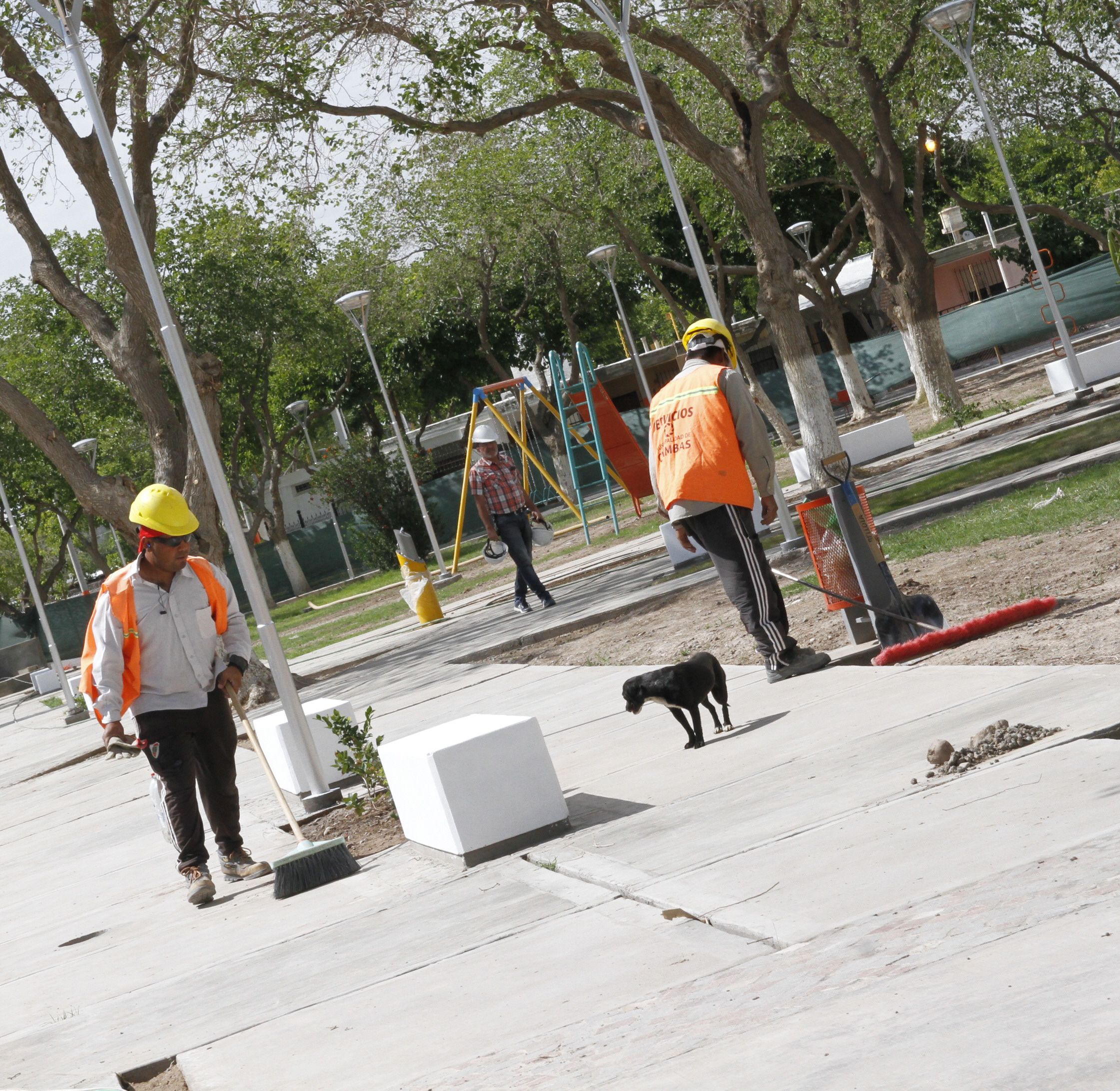 Ultimando detalles. Personal de la Municipalidad de Chimbas trabaja a contra reloj para dejar el parque como nuevo. Están colocando juegos y acondicionando los veredines y el sistema de riego.