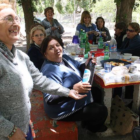 Ni bien bajaron del colectivo, cada uno se encargó de diferentes tareas como si alguien se las hubiera asignado. Algunas mujeres limpiaron las mesas y asientos, otras empezaron el mate y los pocos hombres del grupo se encargaron de prender el fuego para el asado. Pasadas las 13 del mediodía, la picadita y el mate fueron la previa al almuerzo, luego del que les esperaban algunos juegos como el "dígalo con mímica" y un "ta-te-ti humano". El día de recreación y distracción terminó con una visita a las Cavas de Zonda, antes de llevarlos nuevamente hasta sus centros de jubilados.