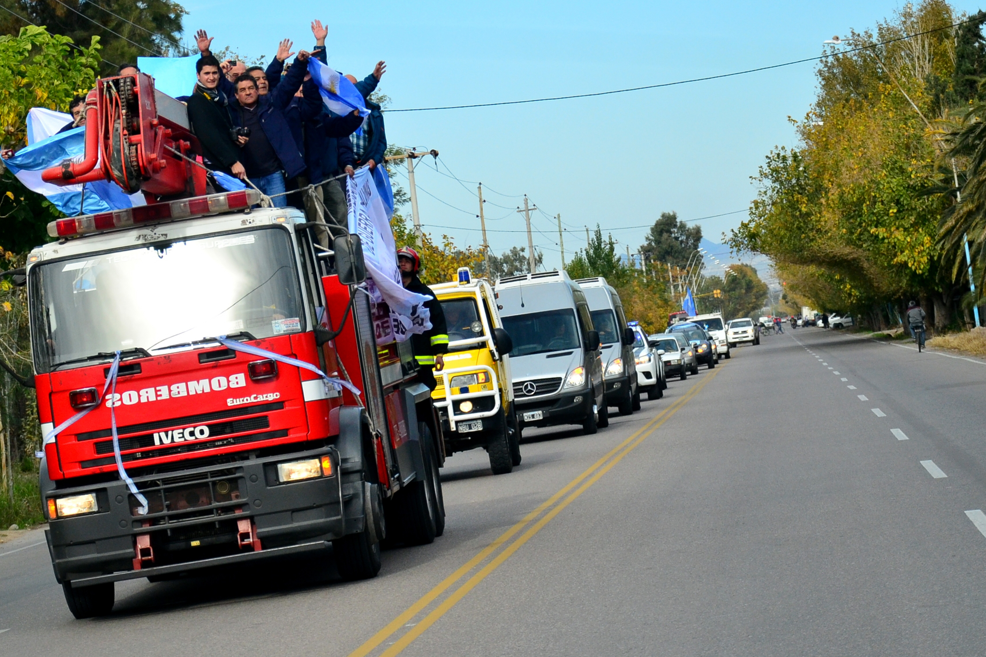 Tras los besos y abrazos interminables, y de las lágrimas de emoción, arrancó la caravana con los excombatientes sobre la autobomba de Bomberos y con un clima patriótico. No sólo los familiares y amigos de los viajeros enarbolaron banderas y albicelestes para darles la bienvenida. Los vecinos de las zonas por donde se realizó el recorrido de la caravana salieron a las veredas agitando banderas y globos celestes y blancos, mientras que otros prefirieron usar una camiseta futbolera con esos colores. Todos coincidieron en gritar “¡Argentina! ¡Argentina!”, al igual que en una cancha de fútbol, para saludarlos.