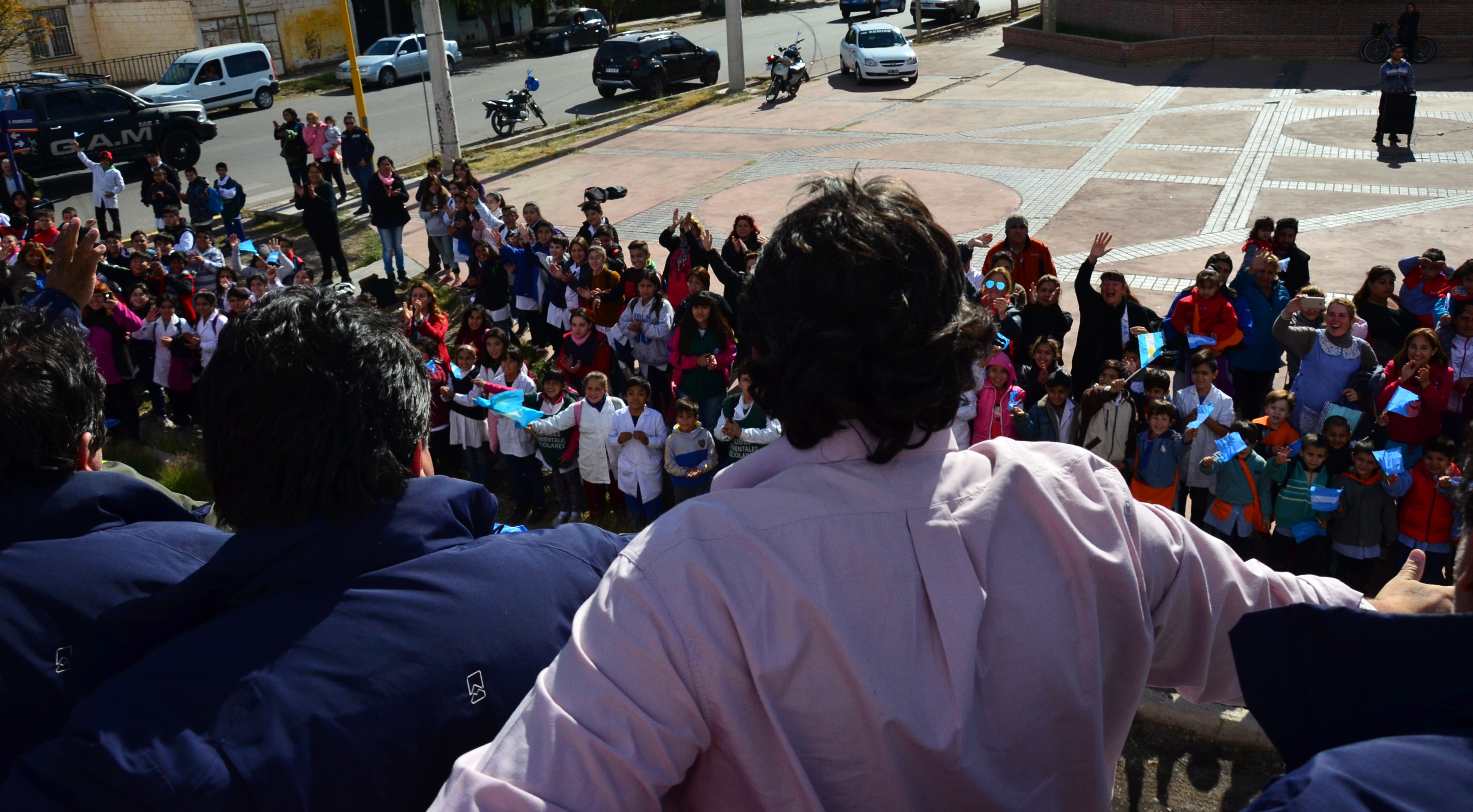 El avance de la caravana se hizo lento. Es que el contingente pasó por 5 escuelas durante el recorrido. En cada una aminoró la velocidad para que los chicos pudieran saludar desde lejos a los excombatientes. El saludo consistió en agitar con energía las banderas y carteles de bienvenida que hicieron para la ocasión. La misma postal se repitió en todos los edificios escolares por los que pasó.
