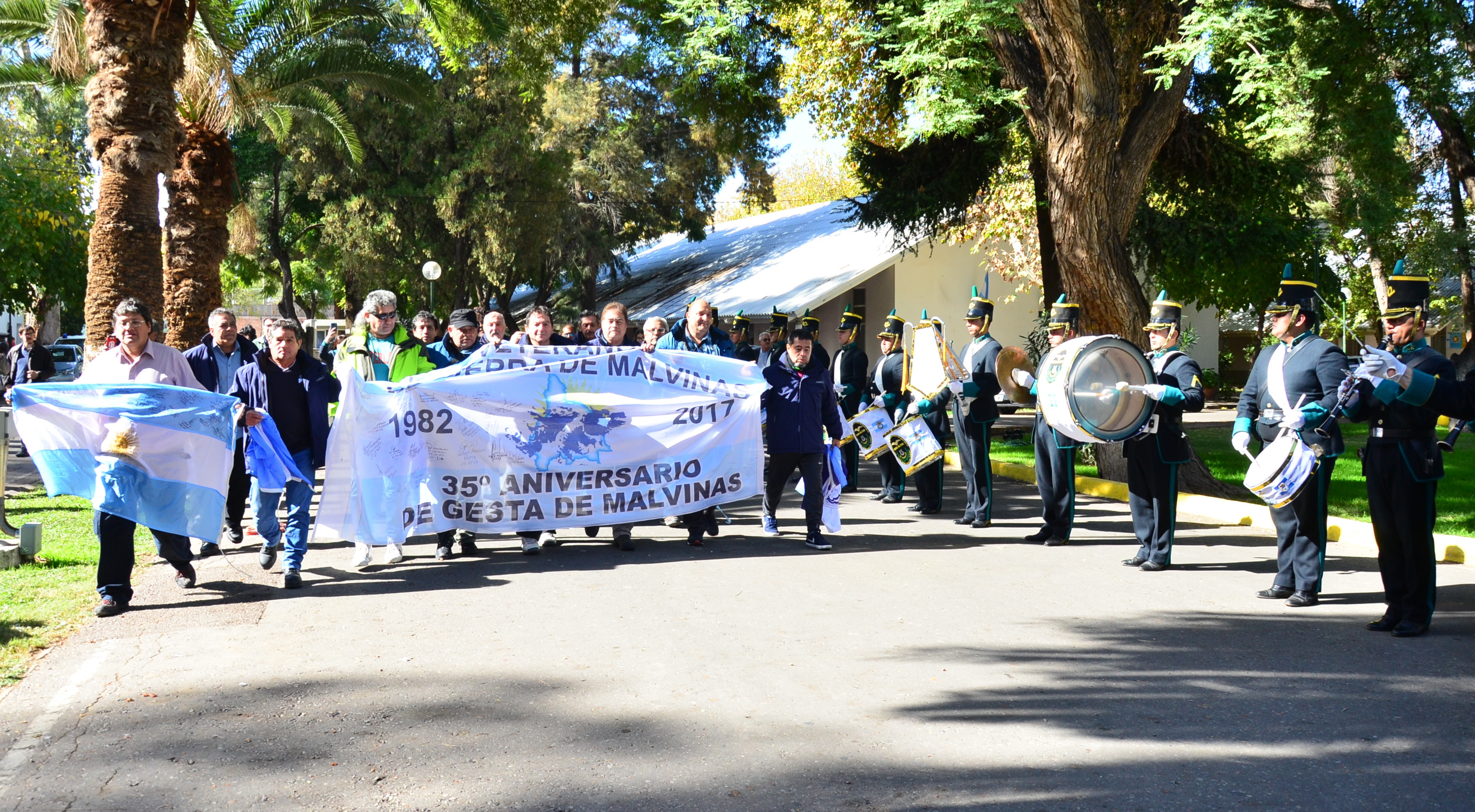 y avanzando al son de la Marcha de Malvinas interpretada