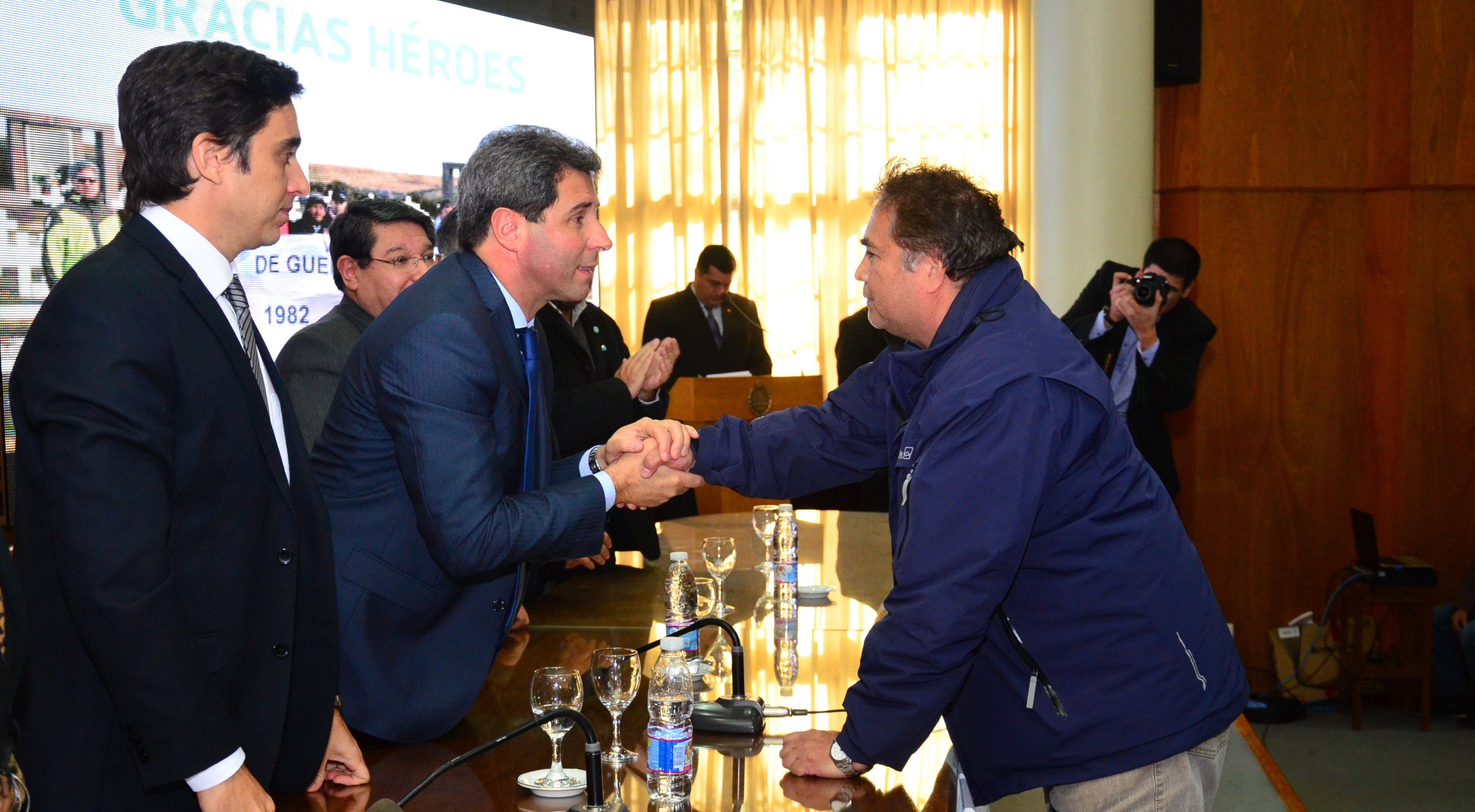 Antes del inicio del acto formal de bienvenida a los excombatientes en la Casa de Gobierno, se proyectó un video de los viajeros en las Islas Malvinas donde cada uno hizo una breve declaración sobre la emoción de pisar esa tierra.