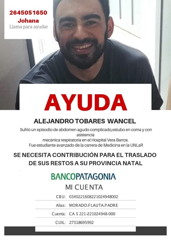 En la tarde de este sábado, después de sufrir una inesperada enfermedad, falleció Alejandro Tobares Wancel. El joven sanjuanino, estudiaba en La Rioja, donde murió. Ahora, sus compañeros y amigos piden ayuda para colaborar con su familia.