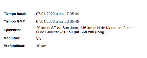 Según los datos preliminares del Instituto Nacional de Prevención Sísmica, el temblor se produjo a 10 kilómetros de profundidad, en la cercanía de la Quebrada de los algarrobos.