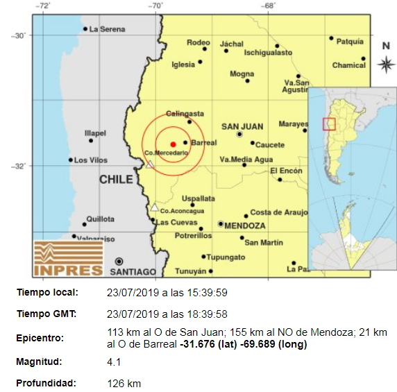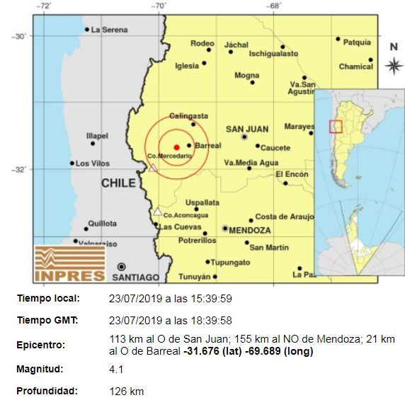 Así lo comunicó la página web del INPRES. El temblor ocurrió exactamente a las 15.39 y tuvo una profundidad de 126 kilómetros. El epicentro fue a 21 kilómetros de la localidad calingastina de Barreal, mientras que una distancia de 121 km lo separó del centro sanjuanino.