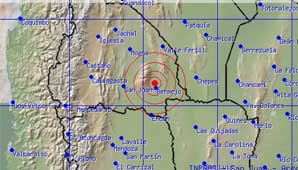 Con una profundidad de 10 km, el epicentro se ubicó a 75 Km al este-noreste de la ciudad de San Juan, más precisamente en las Sierras de Pie de Palo.