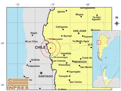 Según datos del INPRES, el epicentro fue 139 km al NO de Mendoza; 173 km al SO de San Juan; 64 km al N de Las Cuevas -32.240 (lat) -70.120 (long). Eso es en Calingasta, cerca del límite con Mendoza y Chile.