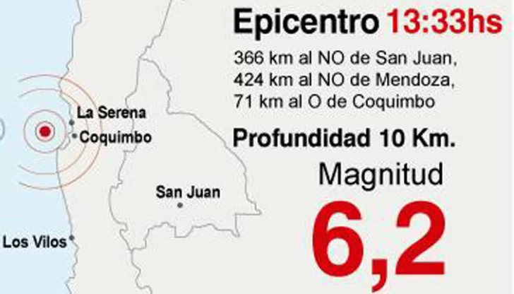 El epicentro del sismo, de movimiento oscilatorio, tuvo lugar en el Océano Pacífico, muy cerca de la costa, a la altura de Coquimbo. Y su profundidad fue de sólo 10 km.