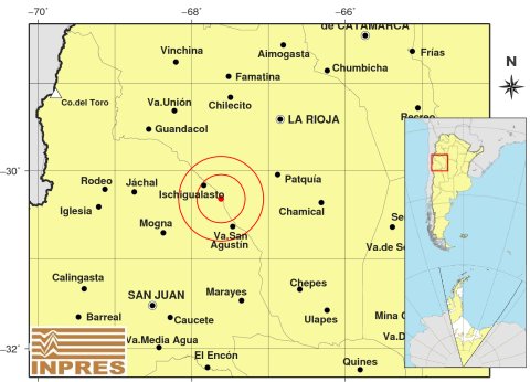 El epicentro se ubicó 125 kilómetros al Sudoeste de La Rioja; 157 kilómetros al Noreste de San Juan; y 27 kilómetros al Sudeste de Ischigualasto.