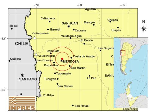 El epicentro se ubicó 8 kilómetros al Norte de Mendoza y 146 kilómetros al Sur de San Juan, a una profundidad de 37 kilómetros.
