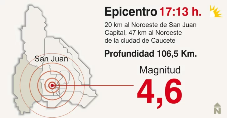 Según el Instituto Nacional de Prevención Sísmica, el movimiento tuvo un epicentro en a 20 kilómetros al Noroeste de la ciudad de San Juan, a 165 kilómetros al Norte de Mendoza y a 47 kilómetros al Noroeste de Caucete.