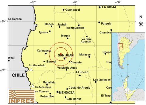 El epicentro se ubicó 25 kilómetros al Noroeste de San Juan; 170 kilómetros al Norte de Mendoza; y 51 kilómetros al Noroeste de Caucete.