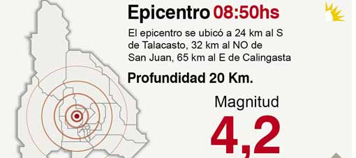 La información oficial indica que el epicentro se ubicó a 24 kilómetros al Sur de Talacasto, 32 kilómetros al Noroeste de San Juan, 65 km al Este de Calingasta.
