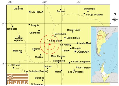 Según los datos oficiales, la hora exacta del movimiento telúrico es 15.59 y el epicentro fue a 148 kilómetros al Oeste de Córdoba y 213 kilómetros hacia el Sureste de la capital riojana.