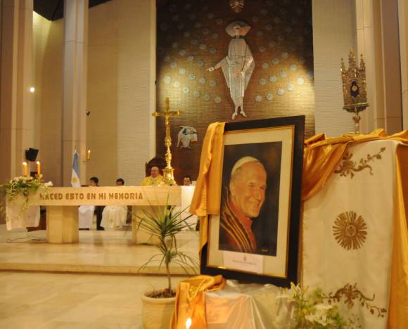 Fue el padre Rómulo Cámpora quien hizo los trámites para que esta reliquia llegara a San Juan y la instalaran en la Catedral. Según el párroco, la gota de sangre fue sacada del cuerpo del pontífice cuando aún estaba con vida. Cuando le extrajeron sangre para hacerle unos análisis, su secretario personal pidió a los médicos conservar una pequeña cantidad de la misma. Luego de la beatificación, se concedió que 8 gotas de esa sangre fueran a distintas iglesias del mundo.