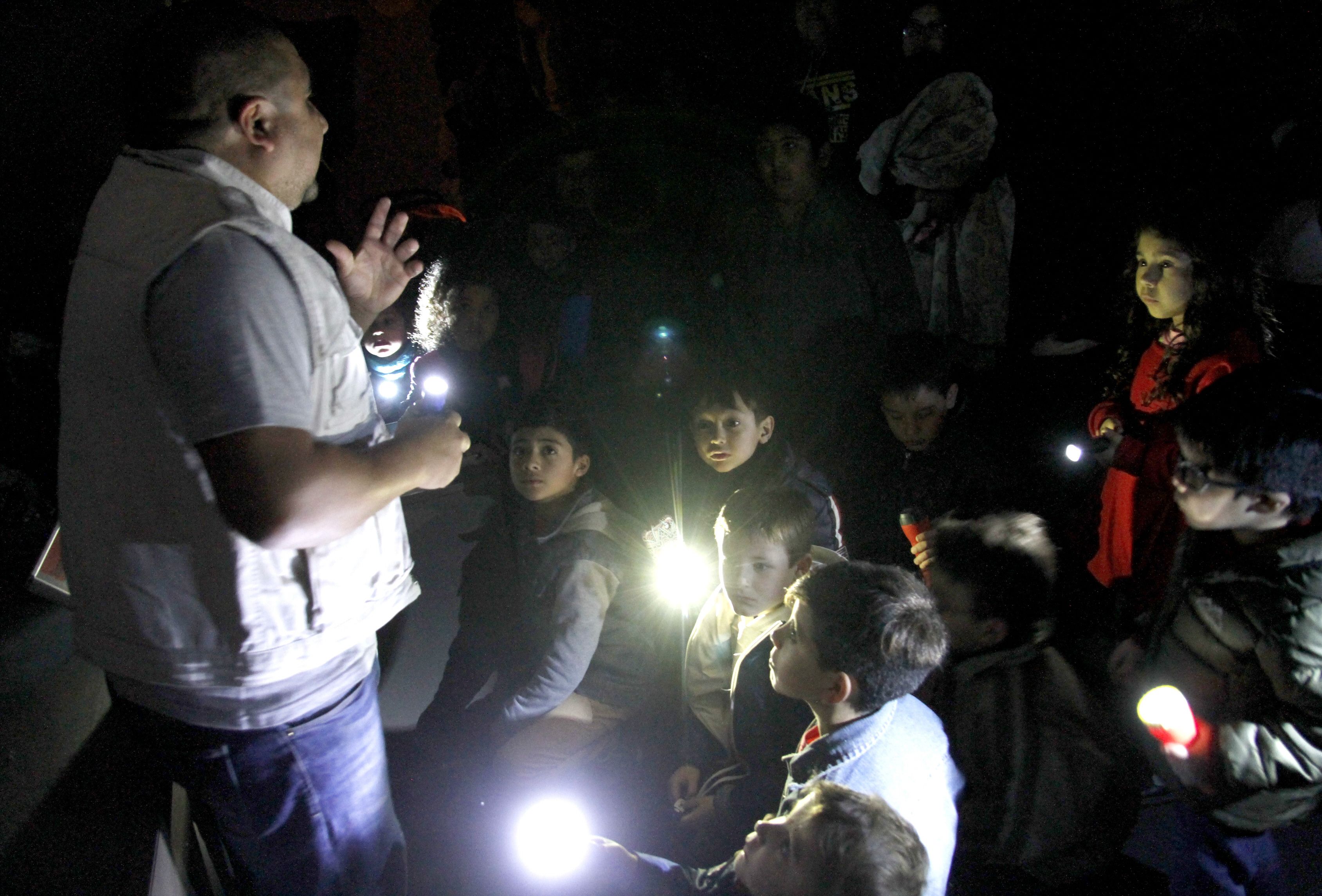 En la primera estación del recorrido, los chicos recibieron las instrucciones. Les contaron de algunos dinosaurios que habitan en el museo y les hablaron de Huesito, la mascota del lugar. Lo primero que hicieron fue probar las linternas para asegurarse de que todos pudieran seguir el recorrido que a simple vista pareció tenebroso, y que con el paso de los minutos se volvió cada vez más aterrador.