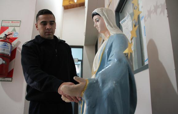 ’Cuando yo llegué, la imagen estaba en el depósito con otros secuestros. Pero decidimos sacarla porque no la podíamos tratar como si fuera cualquier otro elemento robado. La limpiamos y la pusimos en el ingreso a la Seccional para que nos proteja’, dijo Luis Ávila, el jefe de la Comisaría 14, de Zonda. Entonces, algunos vecinos recordaron la historia de la imagen y se mostraron enojados porque piden que sea reubicada.