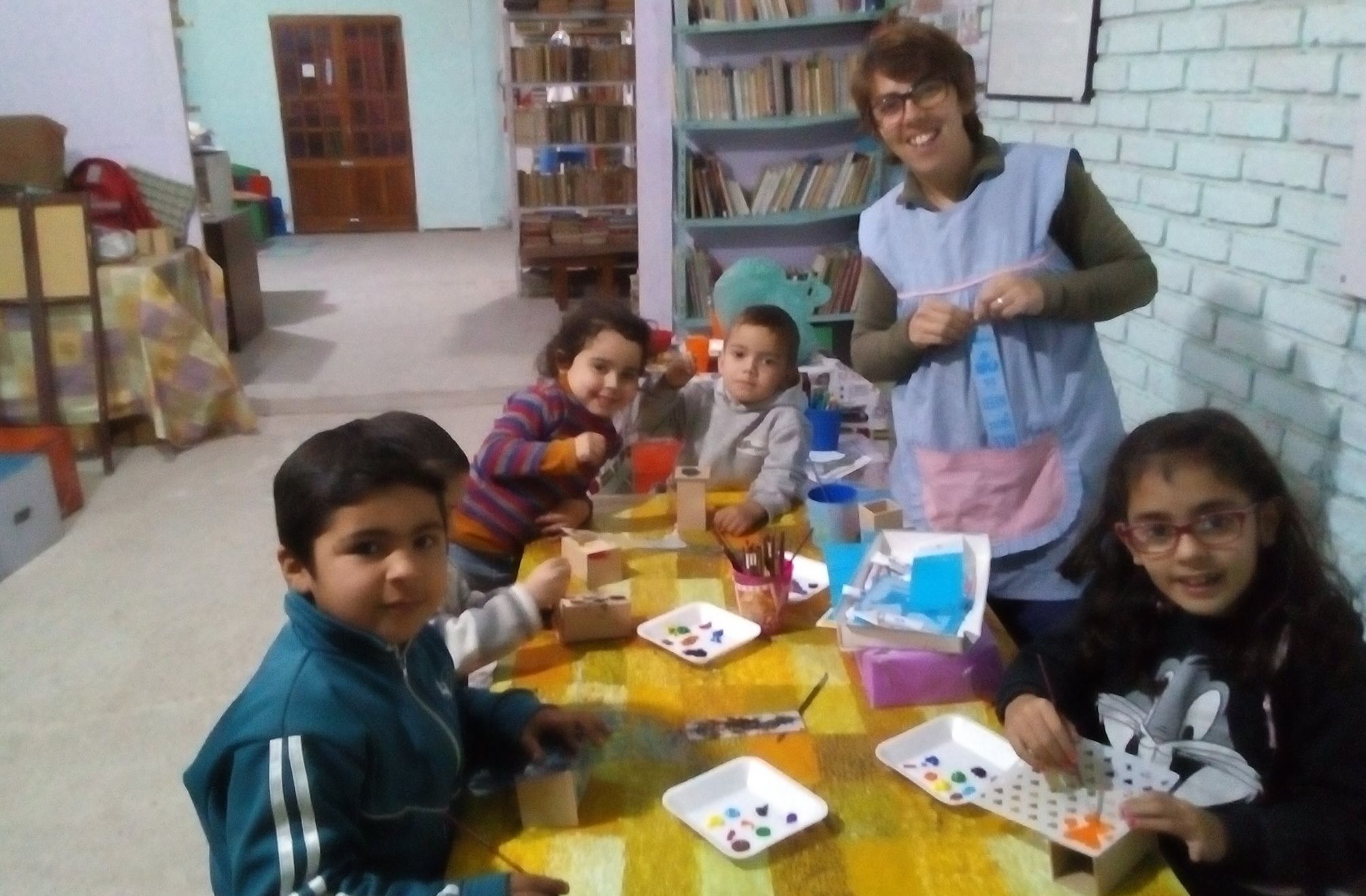 Biblioteca llena de chicos. Los talleres son muy convocantes en la zona. La biblioteca queda colmada de chicos de todas las edades que quieren participar de las actividades. En la biblioteca se dictan talleres durante toda la semana.