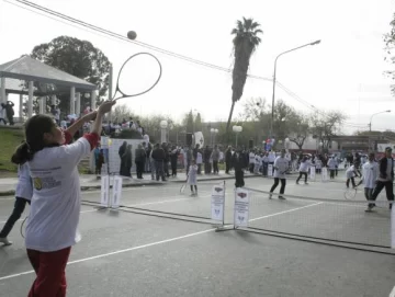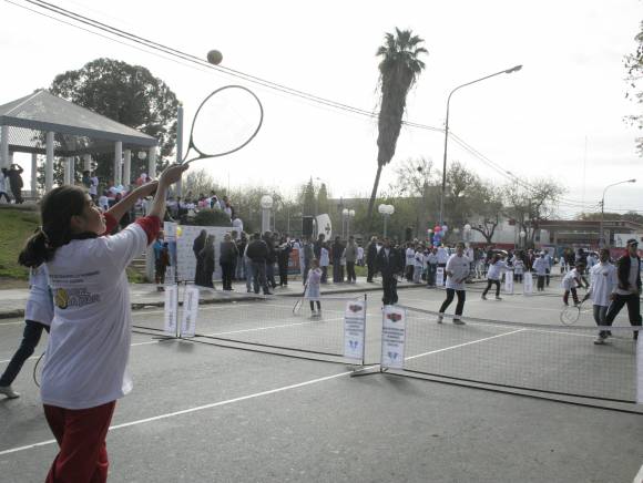 Milagros Belén y Milagros Nahír son gemelas y, según su mamá, rara vez juegan juntas. Pero ayer compartieron un partido de tenis en una de las 24 canchas que se improvisaron sobre la calle San Luis. Y con hinchada incluida. Los chicos que esperaban su turno para entrar en el juego, alentaron a los que estaban jugando, especialmente a los que no lograban hacer que la pelota pasara la red.
